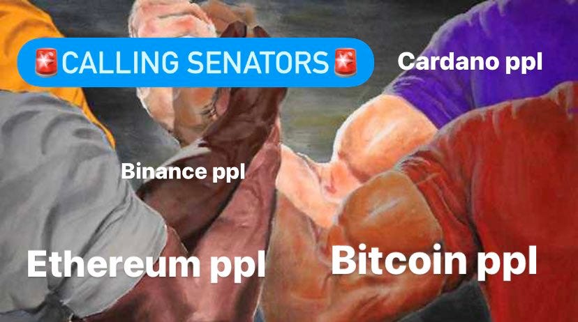 The image above is a reaction to the regulatory scrutiny the crypto industry has been facing recently. The general message could be interpreted as: âEven though we are in different camps in terms of what chain we believe in the most, we are still all believers in cryptoâ. This meme sends the message to the community to remember the values we are fighting to protect.